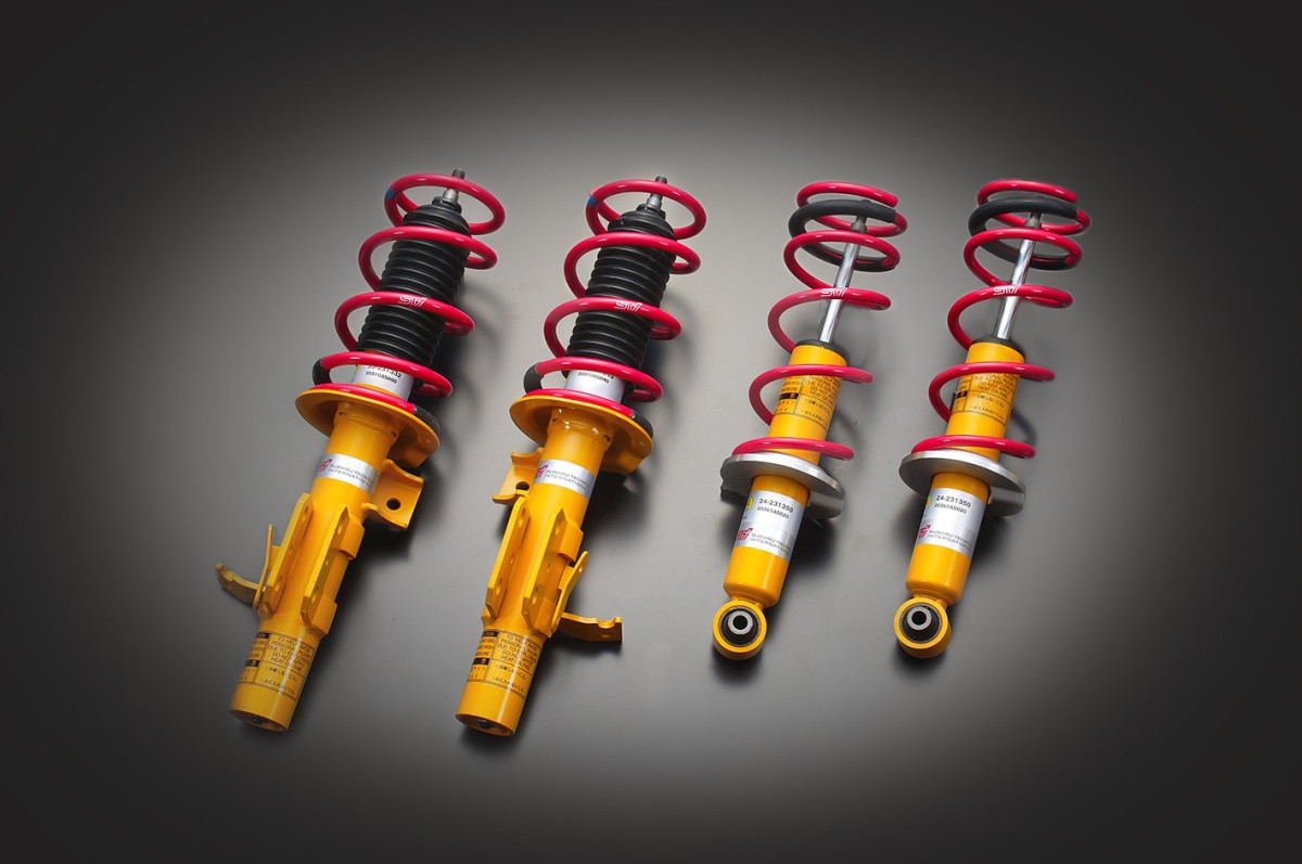 Комплект амортизаторов состоит из передних стоек (левая и правая), задних амортизаторов и комплекта витых пружин F/R. В передней части используется перевернутая стойка, известная своей высокой жесткостью, а высота автомобиля снижена примерно на 15 мм. Это особенно улучшает сходимость колебаний кузова на начальном этапе прохождения поворотов и обеспечивает высокую надежность характеристик крена. Помимо повышения устойчивости при движении, это позволяет осуществлять более уверенное рулевое управление.